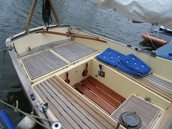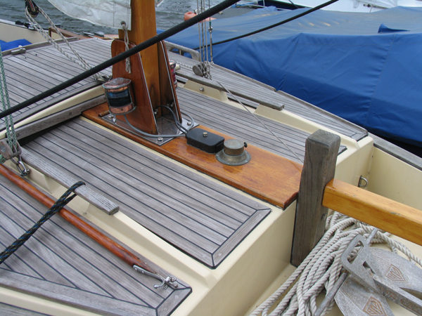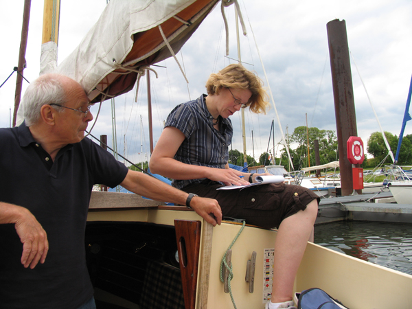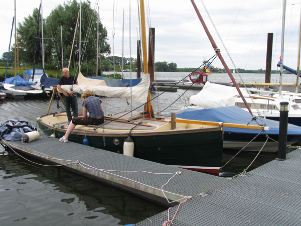 Erste Besichtigung des Bootes in Brüggen und Asselt ![]() Man läuft auf den Steg und ein Boot fällt wirklich aus der Menge heraus Grüner Rumpf, Holzrigg, Aufbau beige ![]() Ein gut begehbares Arbeitsdeck. Ein richtiger Platz für den Anker und ein wunderschöner Bootshaken ![]() Das Cockpit: Unter dem Bulleye liegt der Yanmar Einbaudiesel ![]() Livetest: Anja und Jens passen tatsächlich ins Gehäuse. ![]() Schwachstelle: An ein paar Stellen sieht das Teakdeck nicht mehr gut aus. ![]() ![]() Das Herzstück: Die Gaffel ![]() Die Bootsfrau kontrolliert ![]() Zurück zur Startseite Mehr Infos zu der Bootsklasse: http://www.shrimperowners.org/ | |||||
